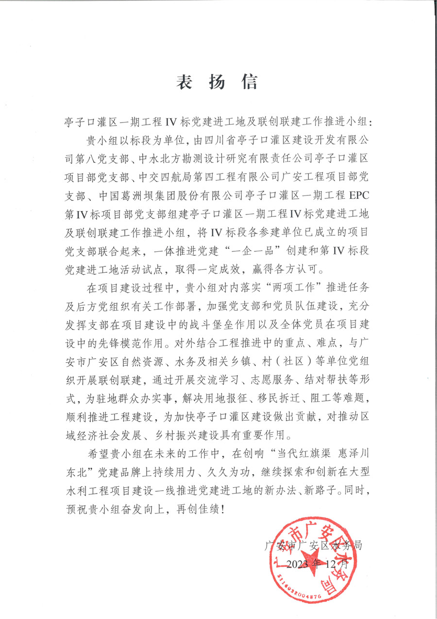 近日,亭子口灌區一期工程第Ⅳ標“黨建進工地”及聯創聯建工作推進小組收到廣安市廣安區水務局發來的表揚信,對企地共建取得的成效表示肯定。這是“黨建進工地”深化黨建引領重大工程建設,充分發揮參建單位黨組織引領作用,凝聚工作合力,破解工程建設難點難題,推動工程有序實施的具體體現。